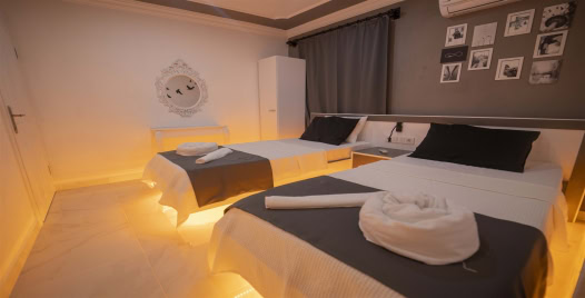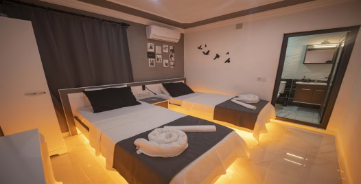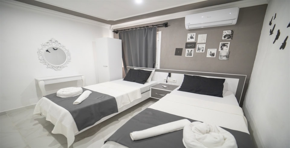 2. Yatak Odası : 2 adet tek kişilik yatak, komodin, klima, makyaj masası, banyo ve lavabo bulunmaktadır.