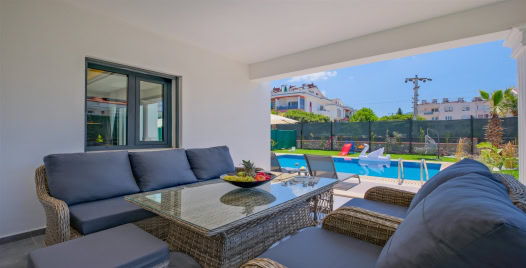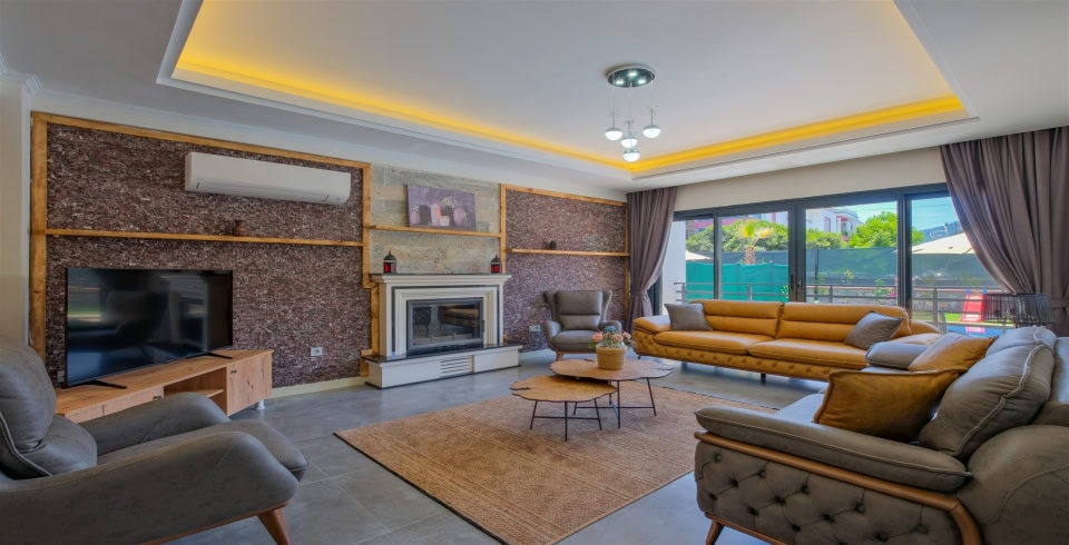 Salon : Konforlu oturma grubu, LCD TV, klima, şömine, uydu sistemi mevcuttur. Havuz terasına çıkış bulunmaktadır.