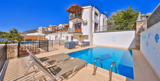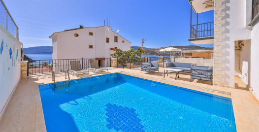 Havuz : Villamızın özel yüzme havuzu bulunmakta olup havuz başından deniz ve kalkan manzarası seyredilmektedir.