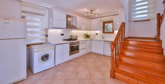 Mutfak: Modern Amerikan mutfakta, buzdolabı,çamaşır makinası, bulaşık makinası, su ısıtıcısı, fırın, 4'lü ankastre ocak, mikrodalga fırın ,4 kişilik yemek masası,yemek takımları,çatal ve bıçak takımları,tencere ve tava takımları,bardaklar bulunmaktadır.