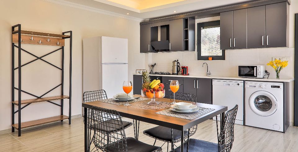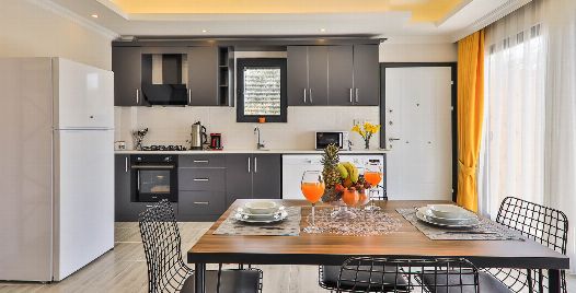 Mutfak : Modern Amerikan mutfakta , buzdolabı, bulaşık makinesi, çamaşır makinesi, ankastre fırın, mikrodalga fırın, ankastre 4’lü ocak, elektrikli su ısıtıcısı(kettle), yemek takımı, çeşitli mutfak araç gereçleri.
