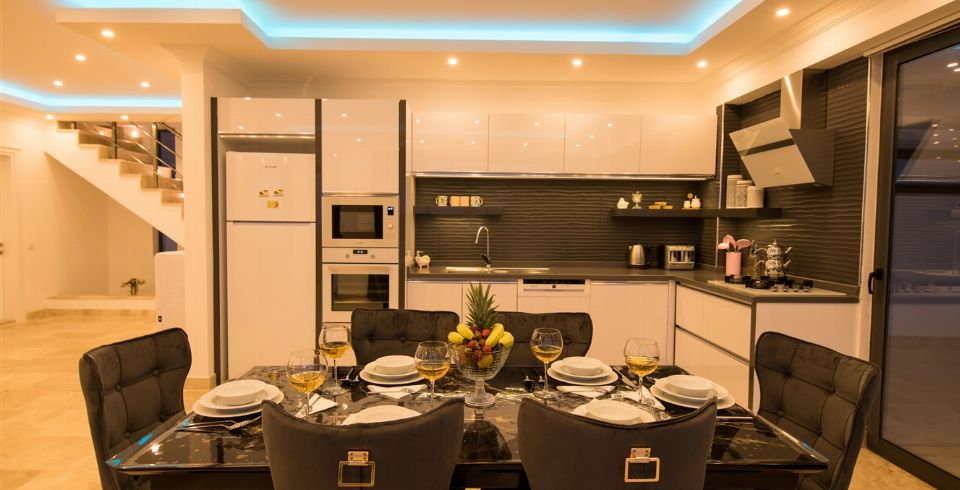 Mutfak : Modern Amerikan Mutfak, altı kişilik yemek masası, buzdolabı, çamaşır makinesi, bulaşık makinesi, ankastre fırın, mikrodalga fırın, 4’lü ocak, tost makinesi, elektrikli su ısıtıcısı, yemek takımı, çatal bıçak seti, tavalar, tencereler, bardaklar mevcuttur. Havuz başına çıkış bulunmaktadır.