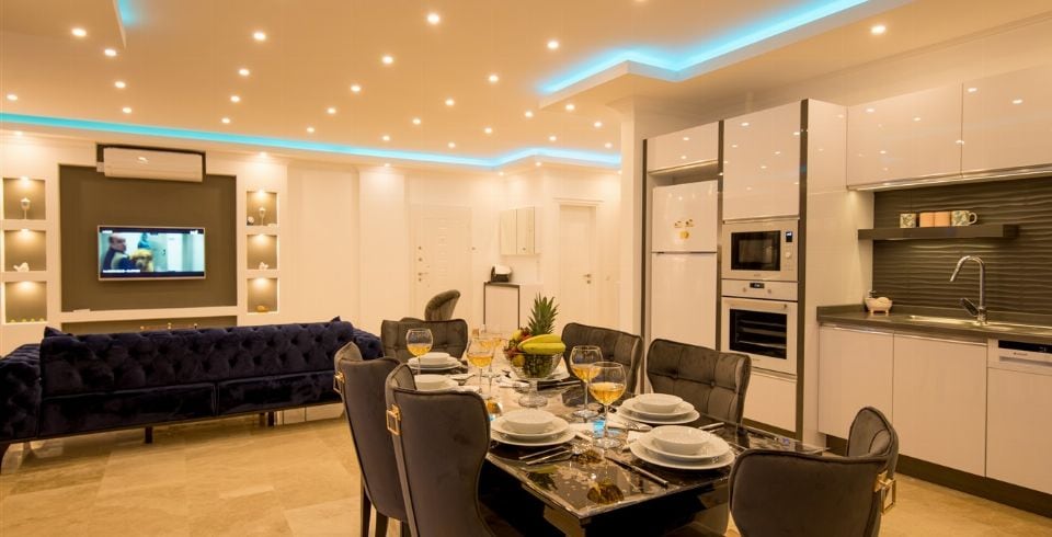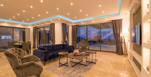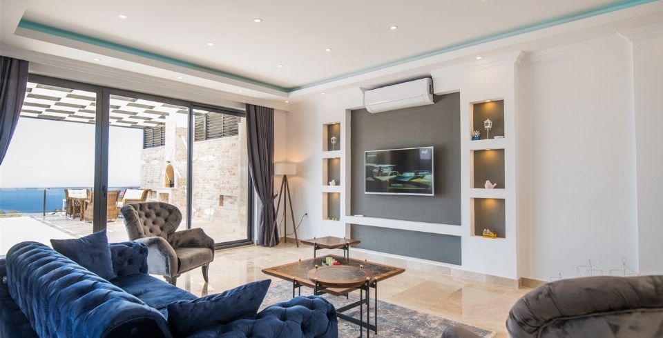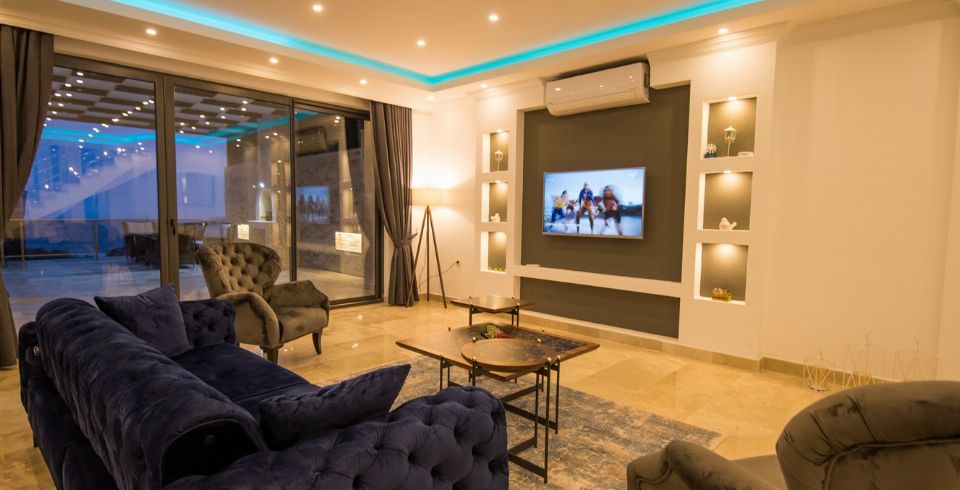 Salon : Oturma grubu, televizyon, uydu alıcısı, sehpa, klima, elektrik süpürgesi, ütü ve ütü masası bulunmaktadır. Havuz terasına çıkış mevcuttur.