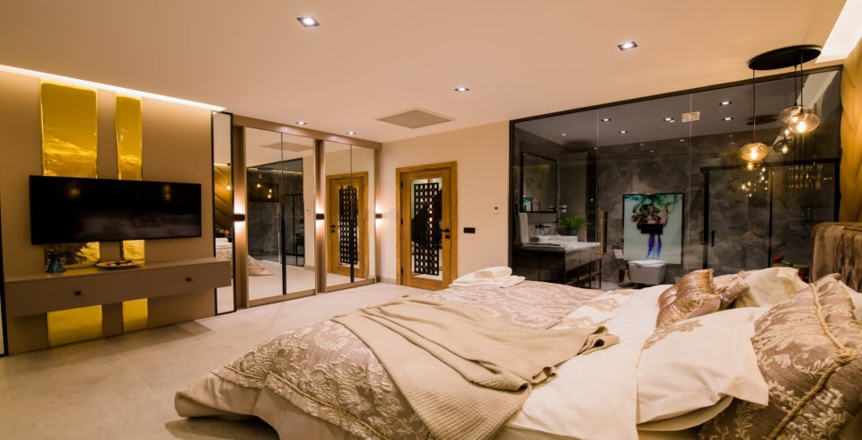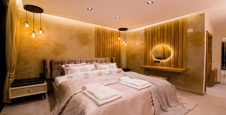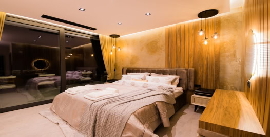1. Yatak Odası : 1 adet çift kişilik yatak, klima, komodin, elbise dolabı, makyaj masası, balkon, jakuzi (balkonda), banyo ve tuvalet bulunmaktadır. 1. 2. ve 3. yatak odalarının balkonları ortaktır.
