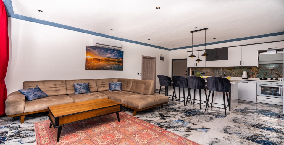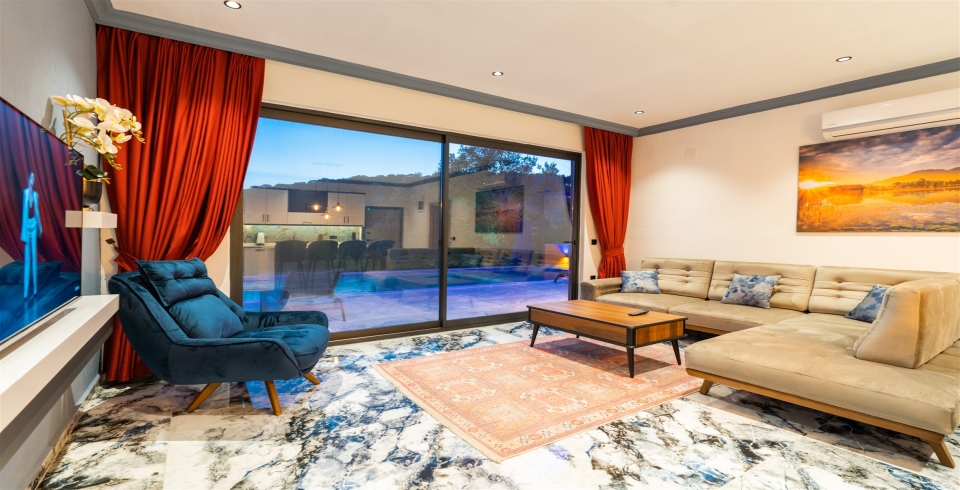 Salon : Villa salonunda oturma grubu, TV, internet, klima, sehpa bulunmaktadır.