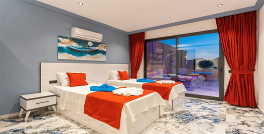 2. Yatak Odası : 2 adet tek kişilik yatak, komodin, klima, makyaj masası, banyo ve lavabo bulunmaktadır.
