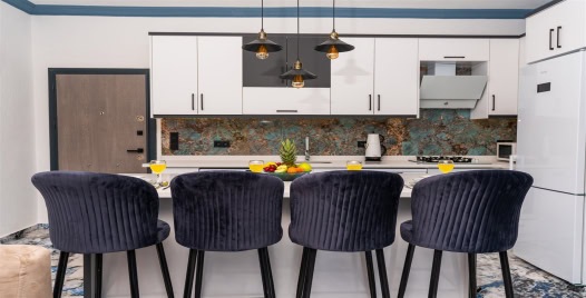 Mutfak : Buzdolabı, çamaşır makinesi, mikrodalga fırın, 4’lü ocak, çatal-bıçak takımı, tencere-tava takımı, bulaşık makinesi bulunmaktadır.