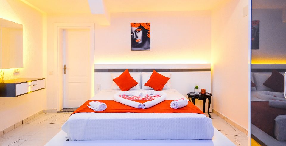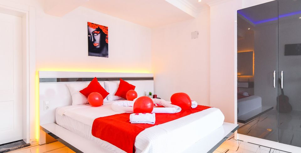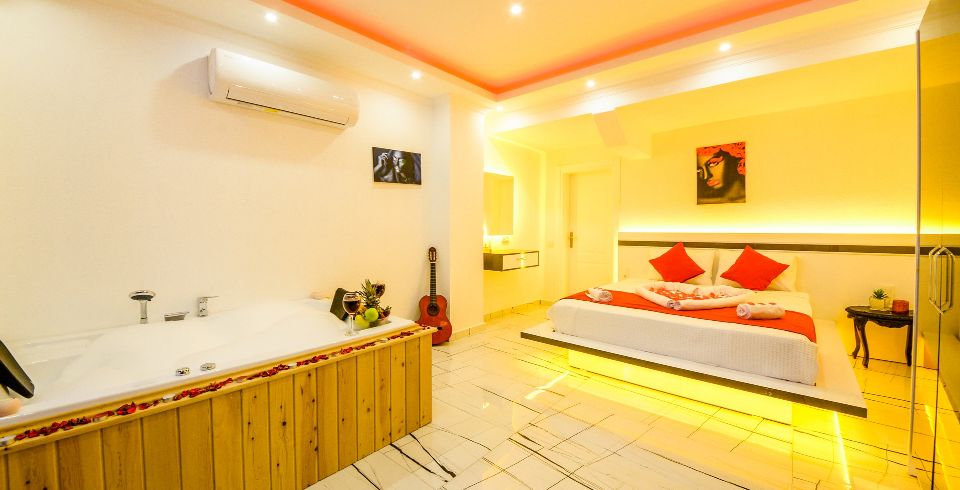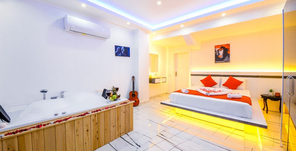 1. Yatak Odası : 1 adet çift kişilik yatak, klima, kapalı havuz, Jakuzi, komodin, elbise dolabı, makyaj masası, banyo ve lavabo bulunmaktadır.