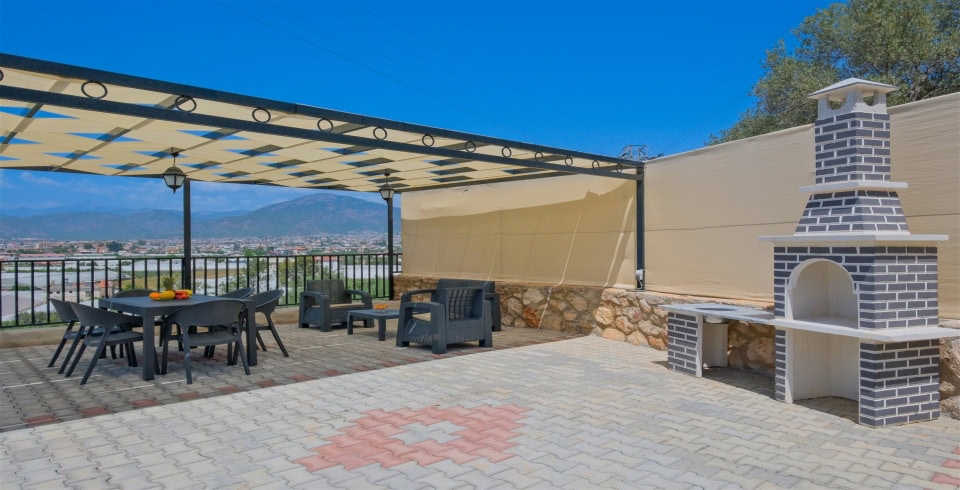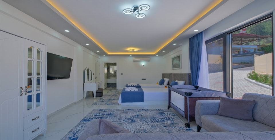 Salon: Villamızın salonunda konforlu oturma grubu, klima, TV, internet, uydu alıcı, yemek masası, sehpa bulunmaktadır.