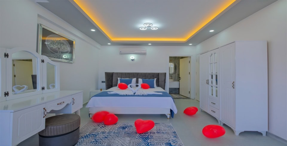 1. Yatak Odası: Çift kişilik yatak, klima, jakuzi,Tv, komodin, elbise dolabı, makyaj masası, banyo ve tuvalet bulunmaktadır.