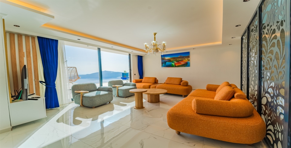 Salon : Villamızın iç dizaynı da son modaya uygun olarak modern bir şekilde tasarlanmıştır. Çeşitli dekoratif eşyalarla süslediğimiz salonumuz havuzlu bahçeye açılıyor. Villa salonunda oturma grubu, TV, internet, klima, sehpa bulunmaktadır.