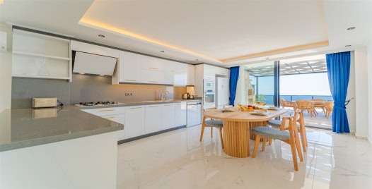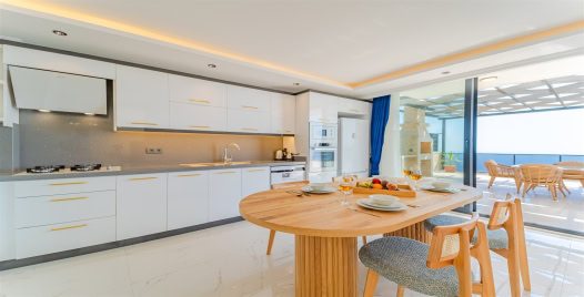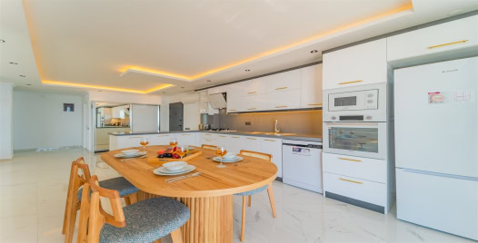 Mutfak : Modern Amerikan mutfağımızda yemek masası, buzdolabı, mikrodalga fırın, 4’lü ocak, ekmek kızartma makinesi, kahve makinası, elektrikli su ısıtıcısı, çatal-bıçak takımı, tencere-tava takımı, bulaşık makinesi çamaşır makinesi, bulunmaktadır.
