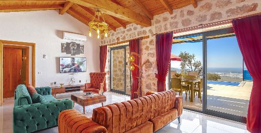 Salon: Salon içerisinde oturma grubu, TV, klima, sehpa bulunmaktadır. Havuz terasına çıkış yapılabilmektedir.