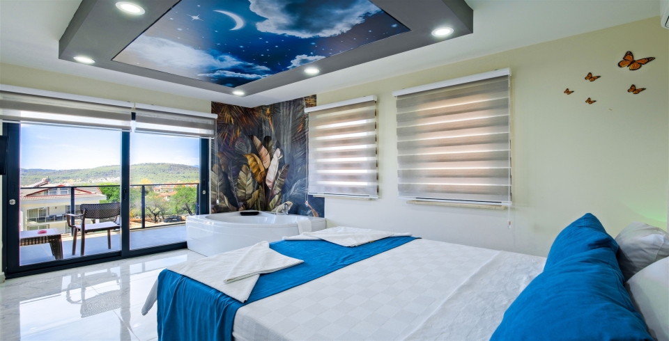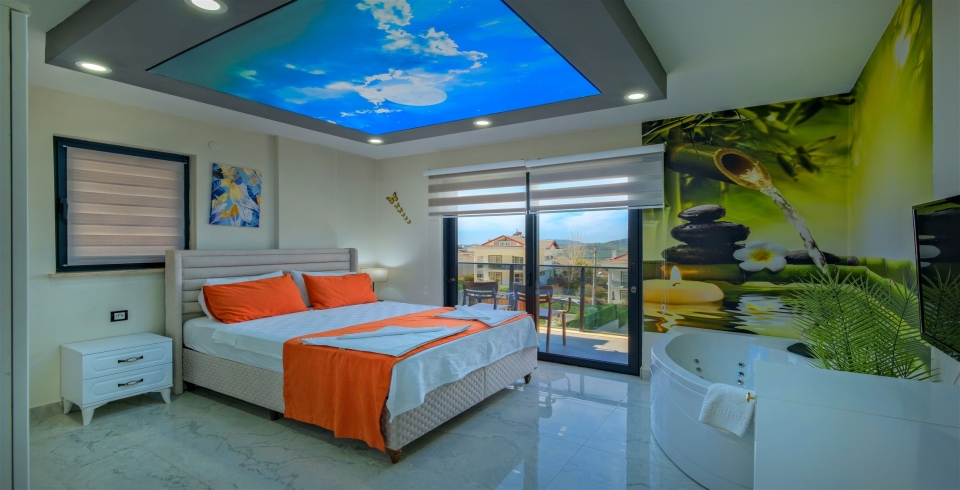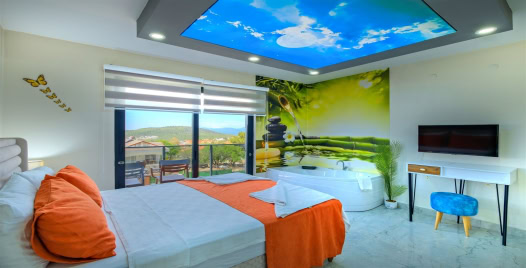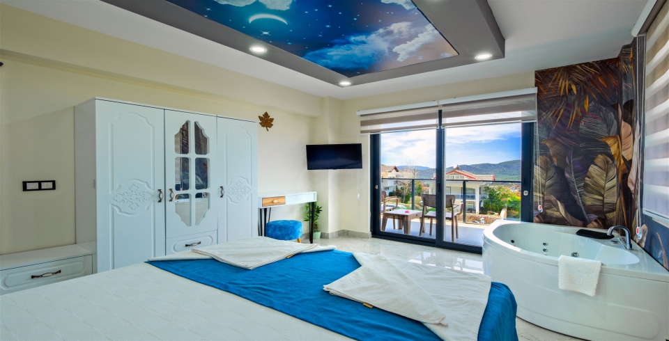 2. Yatak Odası : Süit yatak odası çift kişilik konfor yatak, klima, gardırop, komodin, jakuzi, LCD TV, berjer, banyo-WC yer almaktadır.