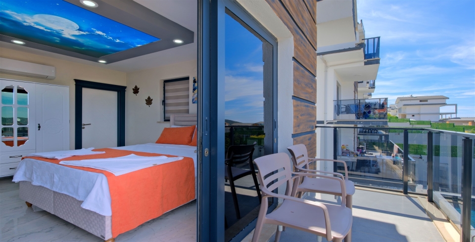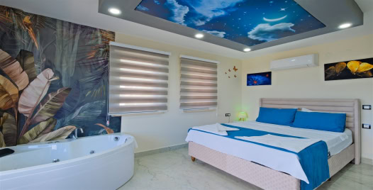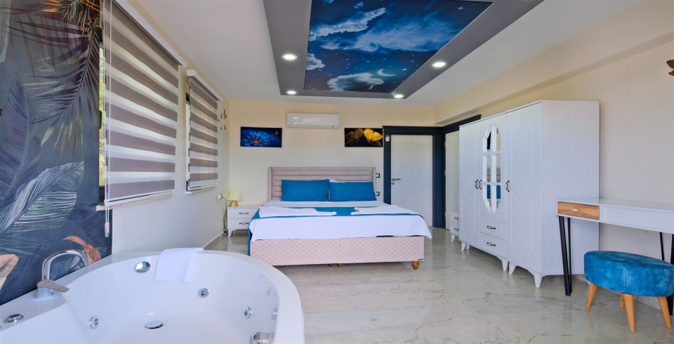 1. Yatak Odası : Süit yatak odası çift kişilik konfor yatak, klima, gardırop, komodin, jakuzi, LCD TV ve banyo-WC almaktadır.
