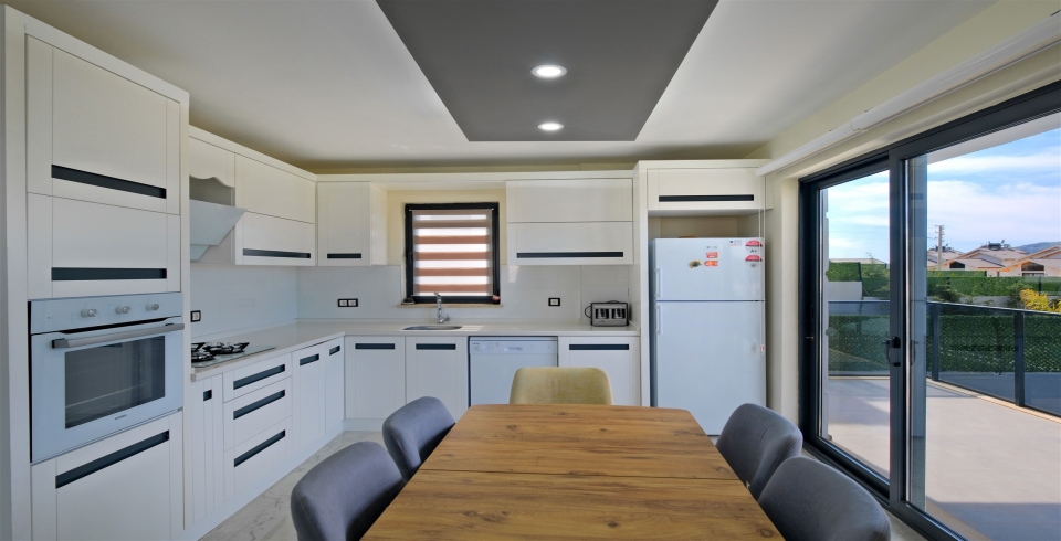 Mutfak : Villa içinde modern Amerikan mutfak bulunmaktadır. Mutfakta, bulaşık makinası, ankastre fırın, buzdolabı, çamaşır makinası, ankastre 4’lü ocak, elektrikli su ısıtıcısı, tencere ve tava takımı, 8 kişilik yemek takımı, kaşık ve çatal seti ve bardaklar bulunmaktadır. Havuz başına geçiş bulunmaktadır.