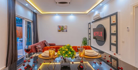 Salon : Salon içerisinde oturma grubu, TV, klima ve sehpa bulunmaktadır. Havuz terasına çıkış yapılabilmektedir.