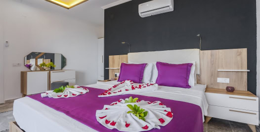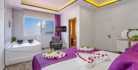 1. Yatak Odası : 1 adet çift kişilik yatak, klima,TV, komodin, elbise dolabı, makyaj masası, jakuzi,sauna, banyo ve tuvalet bulunmaktadır.