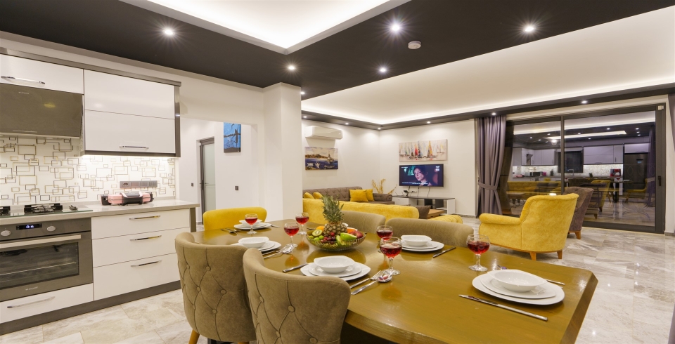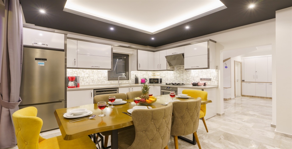 Mutfak : Amerikan mutfak bulunmaktadır. Mutfakta mikrodalga fırın, bulaşık makinası, ankastre fırın, buzdolabı, çamaşır makinası, ankastre 4’lü ocak, elektrikli su ısıtıcı kettle, ekmek kızartma makinası, tencere ve tava takımı, 8 kişilik yemek takımı, kaşık ve çatal seti ve bardaklar bulunmaktadır. Mutfak havuz katındadır.
