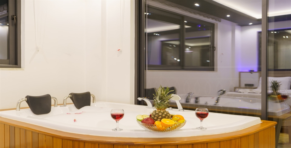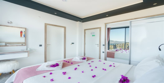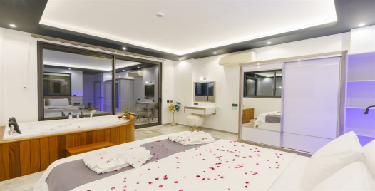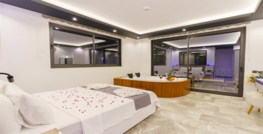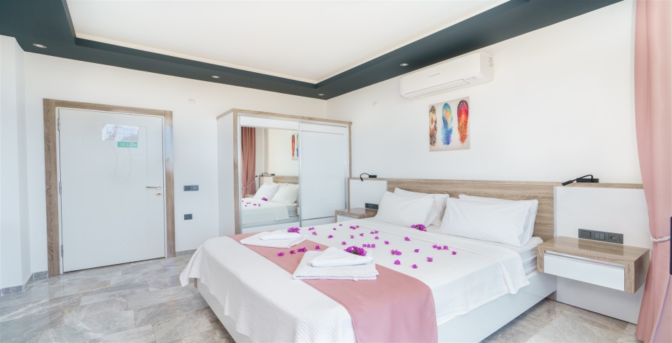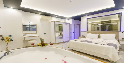 1. Yatak Odası : Çift kişilik yatak, komodin, klima, jakuzi makyaj masası, banyo-WC ve balkon yer almaktadır.