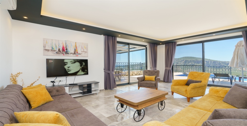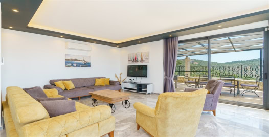 Salon : Salonda klima uydu alıcı, TV, DVD Player, oturma grubu, ütü ve ütü masası, lavabo yer almaktadır ve havuz kenarına çıkış vardır. Salon havuz katındadır. En üst katta dinlenmek ve güneşlenmek için çok geniş bir seyir terası daha vardır. Bu alanda da oturma gurubu, masa ve sandalye bulunur.