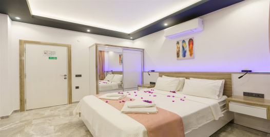 2. Yatak Odası : Çift kişilik yatak, komodin, klima, makyaj masası, banyo-WC ve balkon yer almaktadır.