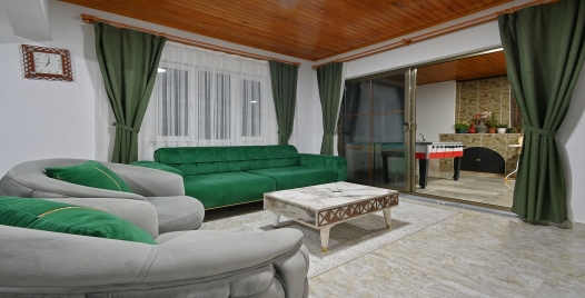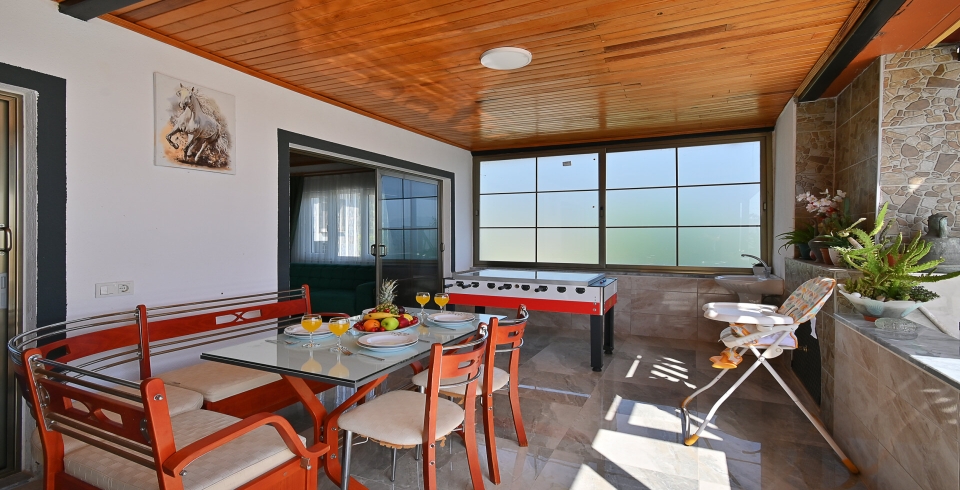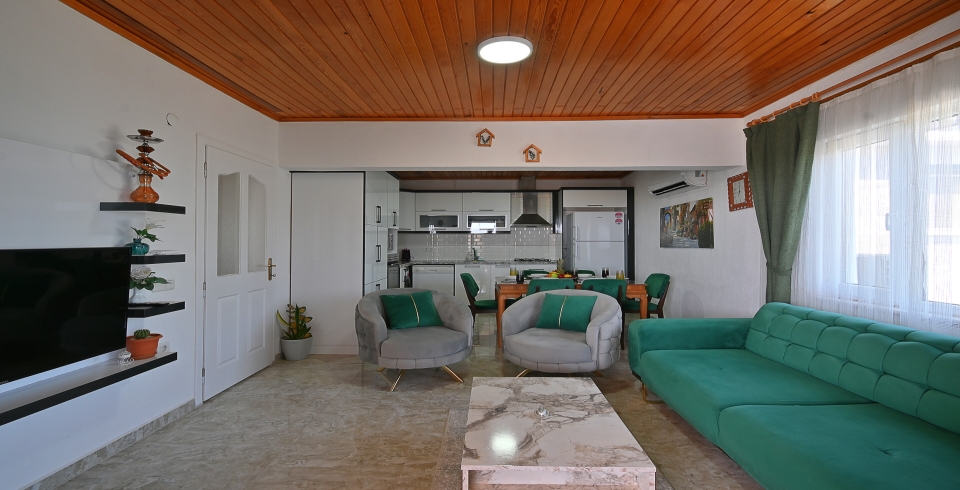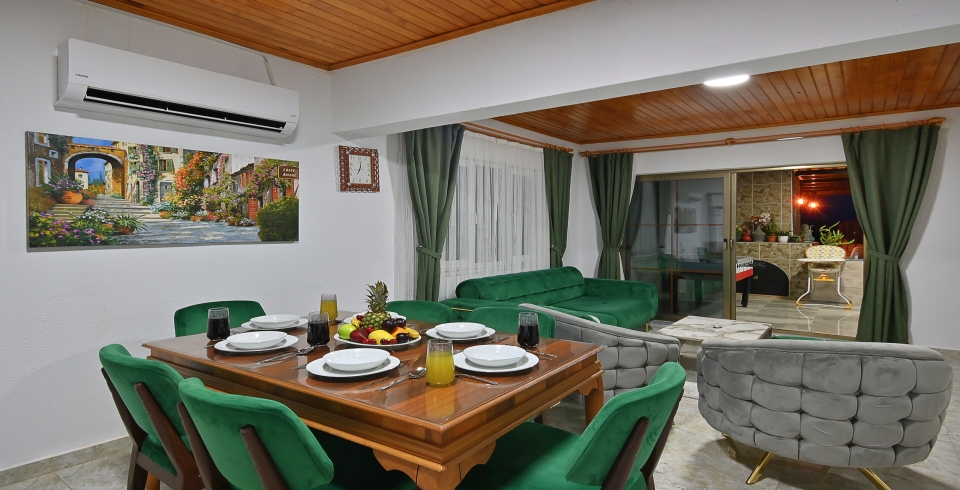 Salon: Özenle döşenmiş salon, modern koltuklar, 4 kişilik yemek masası, LCD TV ve klima, banyo, lavabo bulunmaktadır.