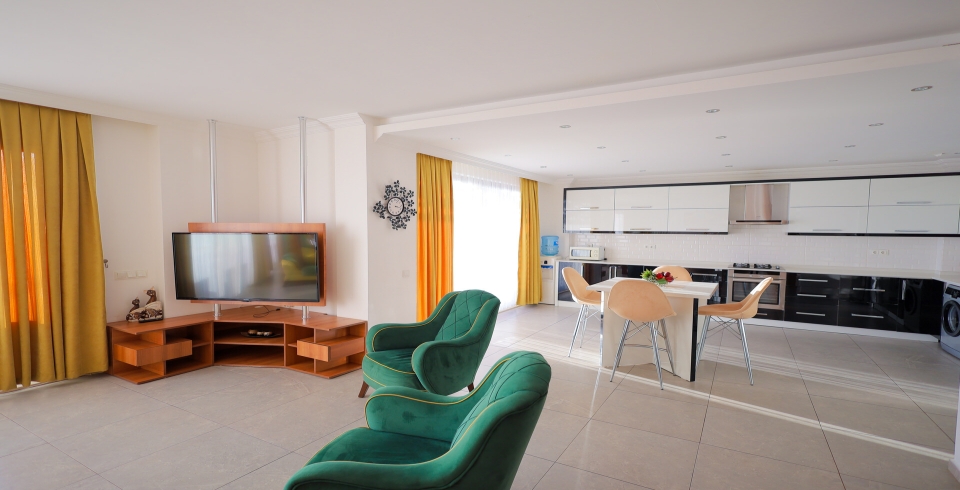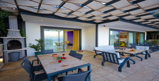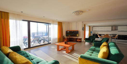 Salon : Salon içerisinde oturma grubu, TV, klima, sehpa bulunmaktadır. Havuz terasına çıkış yapılabilmektedir.