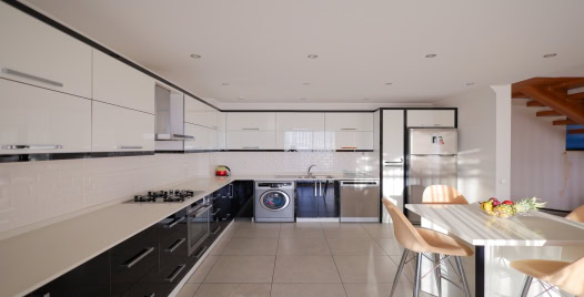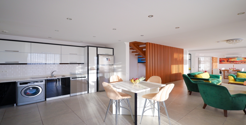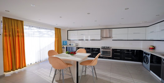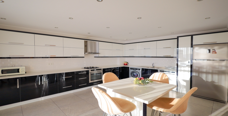 Mutfak : Modern Amerikan mutfak içerisinde buzdolabı, bulaşık makinası, fırın, ocak, mikrodalga fırın, tost makinası, yemek masası, yemek takımları, çatal ve bıçak takımları, tencere ve tava takımları ,bardaklar bulunmaktadır.