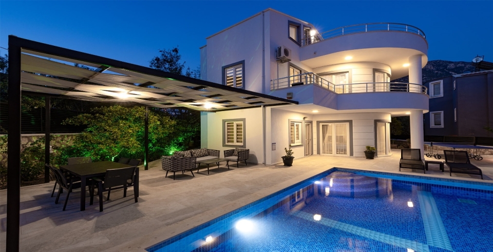 Kalkan günlük kiralık villamızın içerisinde kaliteli, modern ve lüks eşyalar ile özenle dekore edilmiş olup, Kalkan Yazlık Tatil evimiz kalkan merkeze 2 - 3 dakika sürüş mesafesinde, market, manav, restorant gibi tesislerede 1 - 2 dakika araba ile sürüş mesafesinde bulunmaktadır.