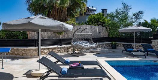 Havuz ve Bahçe: Havuz ve bahçesi korunaklı olup dışarıdan gözükmemektedir. Özel yüzme havuzu, şezlong, şemsiye, salıncak, hamak, yemek masası ve barbekü bulunmaktadır.