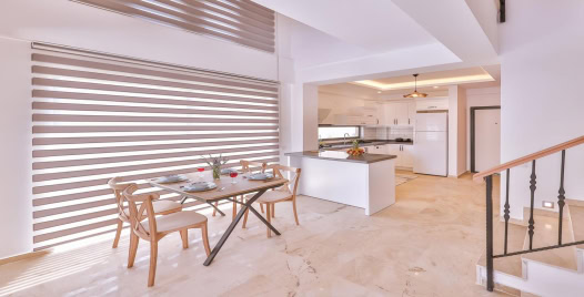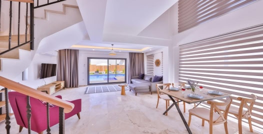 Salon : Villamızın iç dizaynı da son modaya uygun olarak modern bir şekilde tasarlanmıştır. Çeşitli dekoratif eşyalarla süslediğimiz salonumuz havuzlu bahçeye açılıyor. Villa salonunda rahat oturma grubu, TV, klima yer almaktadır.