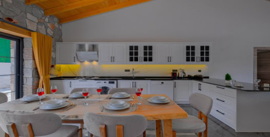 Mutfak: Amerikan mutfak, bulaşık makinası, buzdolabı, ankastre fırın, ankastre 4’lü ocak, su ısıtıcısı, tencere ve tava takımı, yemek takımı, kaşık çatal bıçak takımı, bardak takımı, yemek masası, sandalyeler, çamaşır makinesi. bulunmaktadır.
