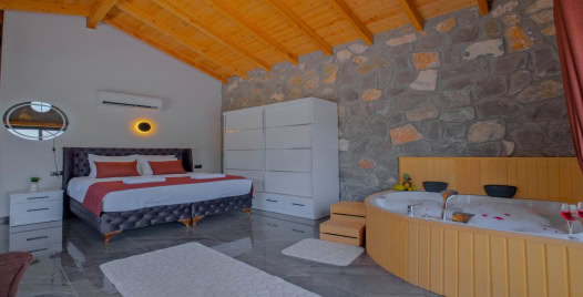 1. Yatak Odası: 1 çift kişilik yatak,jakuzi, komodin, banyo/WC, klima, elbise dolabı, makyaj masası ve berjer bulunmaktadır.