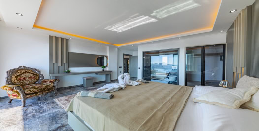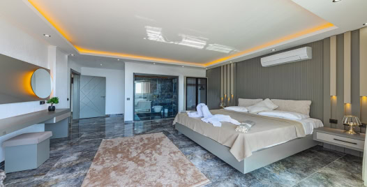 3.Yatak odası: Kiralık villanın bu yatak odasında 1 adet çift kişilik yatak,klima, elbise dolabı,komodin, makyaj masası bulunmaktadır.