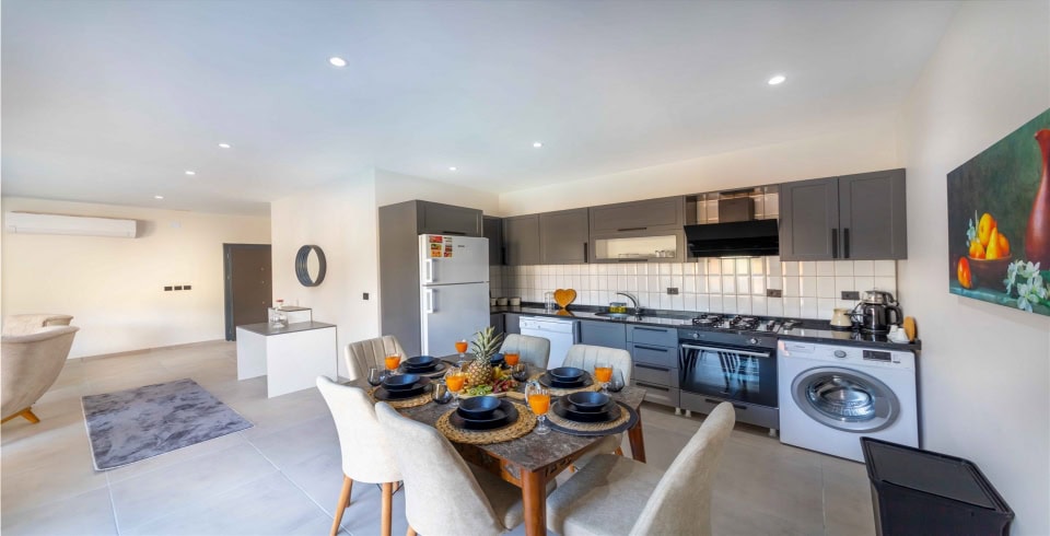 Mutfak : Modern Amerikan mutfakta ; buzdolabı, bulaşık makinesi, çamaşır makinesi, ankastre fırın, 4'lü ocak, tencereler, tavalar, bardaklar, elektrikli su ısıtıcısı, yemek takımı,