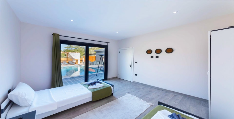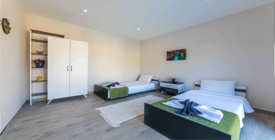 2. Yatak Odası : 3 adet tek kişilik yatak, klima, komodin, makyaj masası, elbise dolabı ve banyo tuvalet bulunmaktadır.