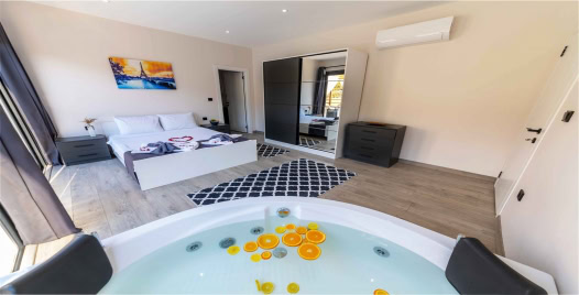 1. Yatak Odası : 1 adet çift kişilik yatak, klima, komodin, makyaj masası, elbise dolabı, jakuzi ve banyo tuvalet bulunmaktadır.
