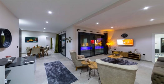 Salon :Amerikan mutfak olarak dizayn edilmiştir, oturma grubu, TV, yemek masası ve klima bulunmaktadır.