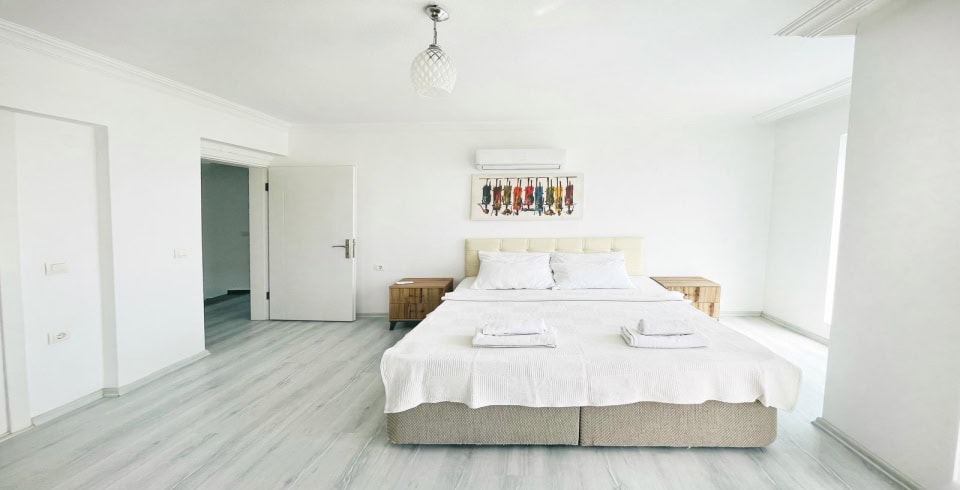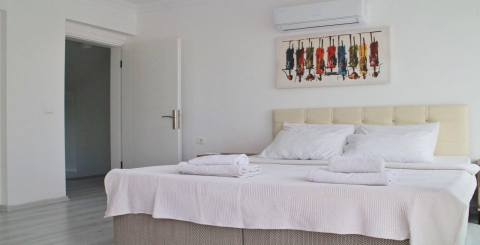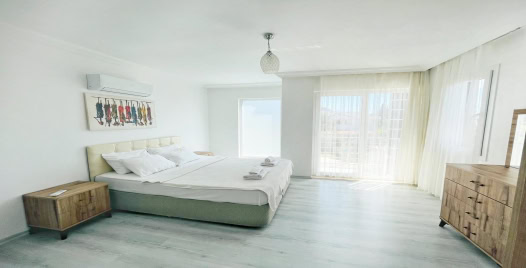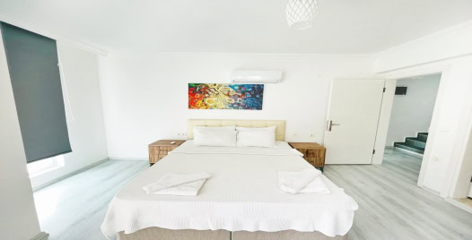 1.Yatak Odası: 1 adet çift kişilik yatak, klima, makyaj masası, komodin, elbise dolabı, banyo ve tuvalet bulunmaktadır.