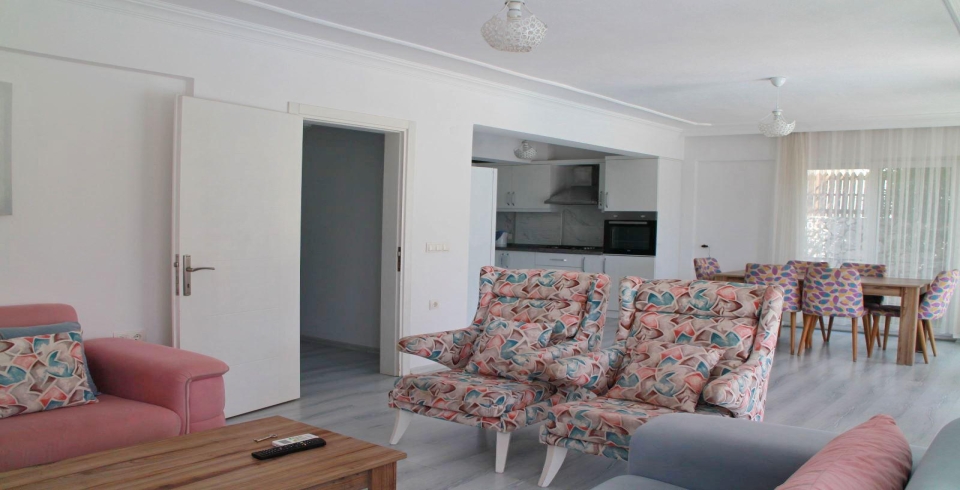 Salon: Oturma grubu, Uydu TV, 8 Kişilik yemek masası, Klima, Havuz kenarına çıkış bulunmaktadır.