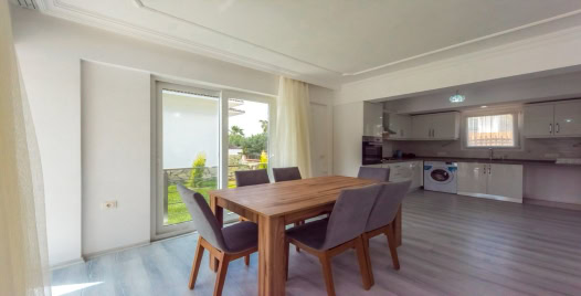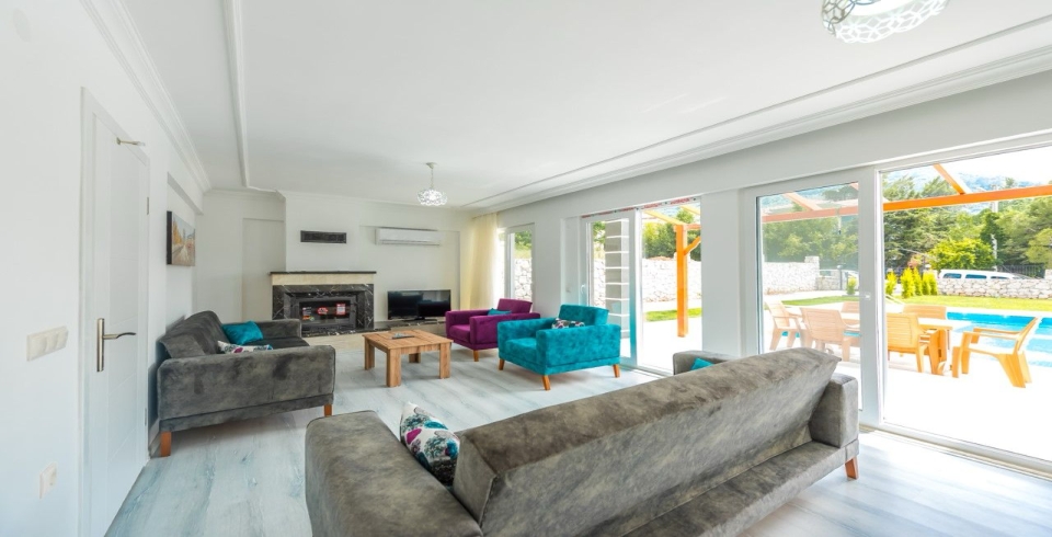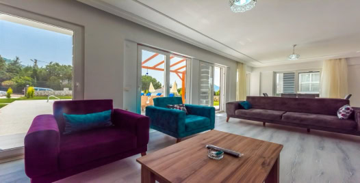 Salon: Oturma grubu, Uydu TV, 8 Kişilik yemek masası, Klima, Havuz kenarına çıkış bulunmaktadır.