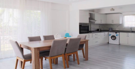 Mutfak: Tam donanımlı modern Amerikan mutfak içerisinde buzdolabı, bulaşık makinesi, fırın, ocak, elektrikli su ısıtıcı, yemek masası, yemek takımları, çatal ve bıçak takımları, tencere ve tava takımları ve bardaklar bulunmaktadır.