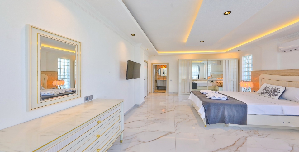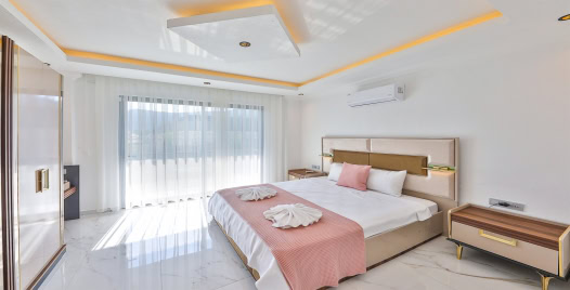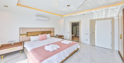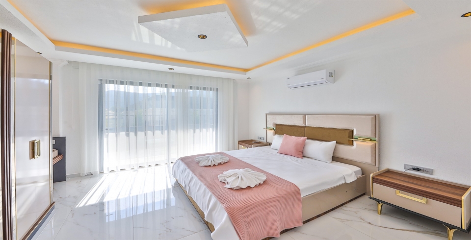 1. Yatak Odası : 1 adet çift kişilik yatak, klima, komodin, elbise dolabı, jakuzi, banyo ve tuvalet mevcuttur.