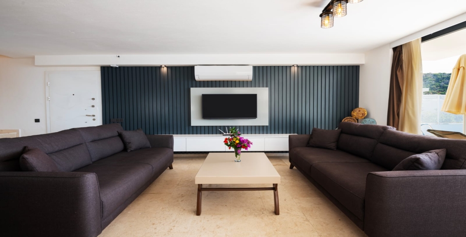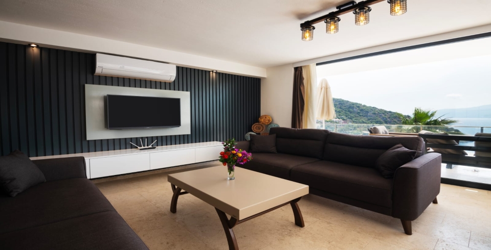 Salon : Villamızın salon kısmında; Oturma grubu, televizyon, klima, sehpa, internet ve havuz terasına çıkış bulunmaktadır.