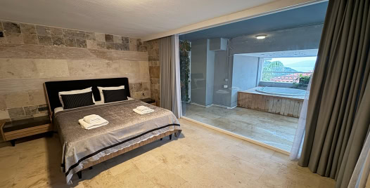 2. Yatak Odası : 1 adet çift kişilik yatak, komodin, gardırop, ebeveyn banyosu, klima, televizyon, balkon ve Jakuzi bulunmaktadır.